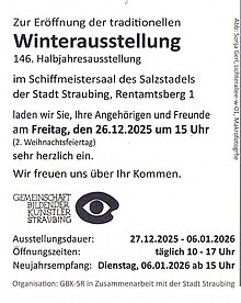 56 Maler, Grafiker, Bildhauer und Objektkünstler aus dem ostbayerischen Raum werden in 96 Werken ihre unterschiedlichen persönlichen Kunstauffassungen und künstlerischen Aussagen in der Sammelausstellung im Schiffmeistersaal im Salzstadel in Straubing präsentieren.
