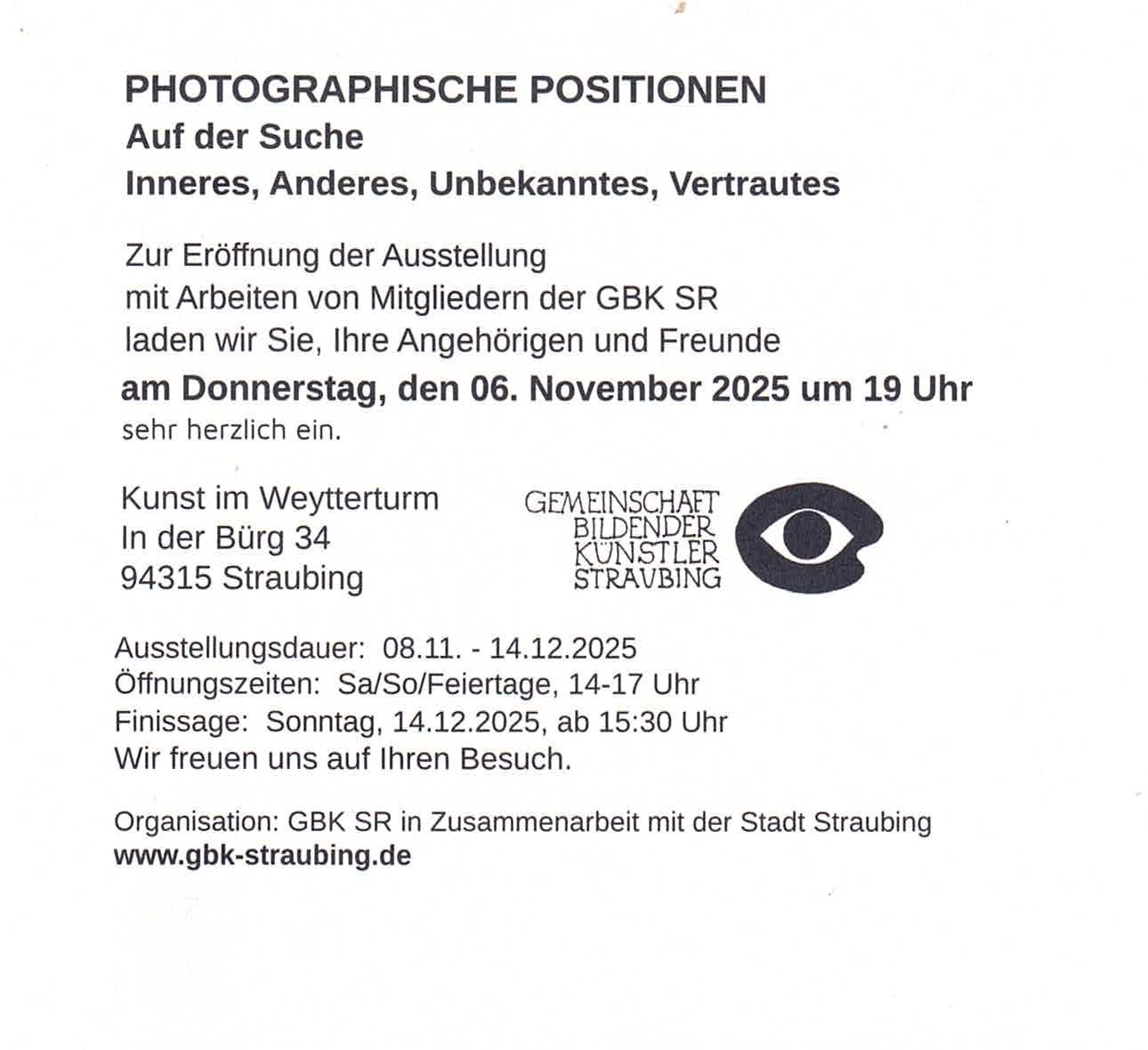 Die einzelnen Positionen gehen von der ureigenen Aussage aus und reihen sich in das Ouevre der jeweiligen Künstler/innen ein. Es gibt aber auch die andere Möglichkeit, dass sich in der Photogra-phie eine eigene, anders sprechende Position herausschält und ein anderes Bild des Urhebers zeich-net. So bieten Wahrnehmung und Ausdruckskraft der einzelnen Fotokünstler/innen überraschende Sichtweisen und gewähren so einen interessanten Einblick in das photographische Oeuvre der GBK-Künstler: