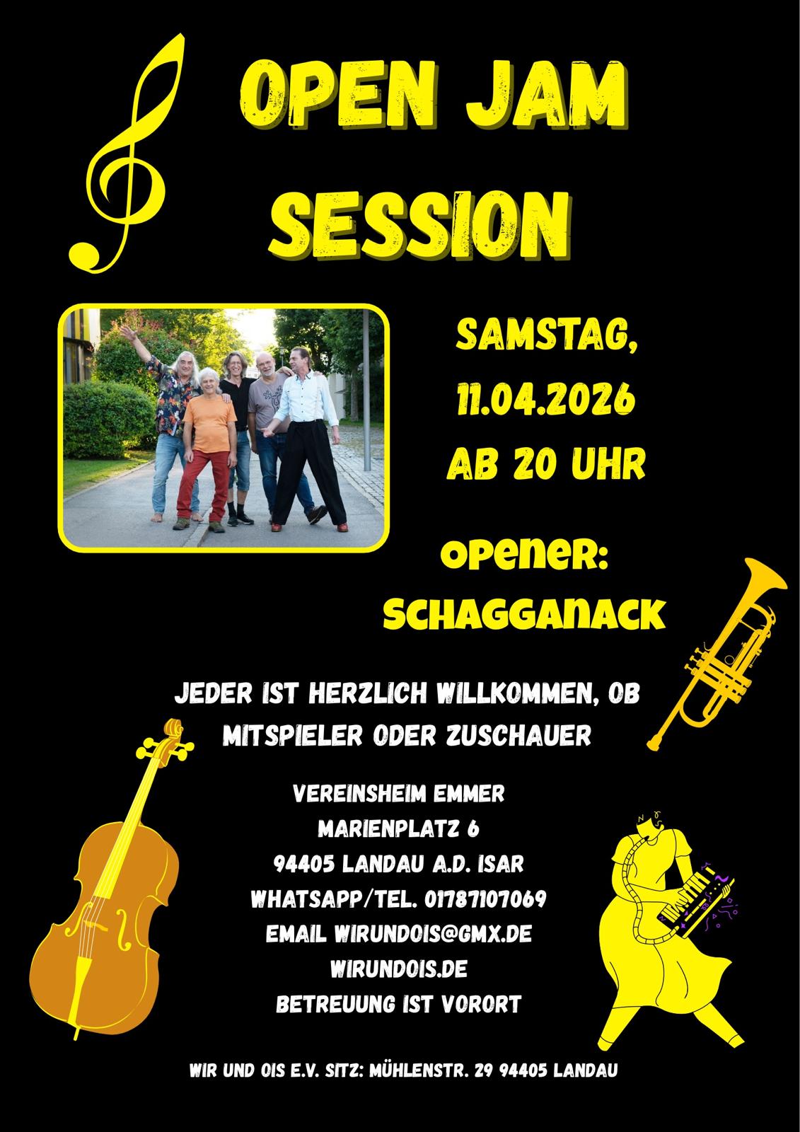 Den Abend eröffnet Schagganack ( Hans Hrda, Gesang (Special Guest); Luck Hiergeist, Gitarre; Peter Eiter, Gitarre; Tom Brunner, Bass; Axel Skupin-Schultz, Percussion) die Session – danach ist die Bühne offen für alle, die Lust auf Musik haben!